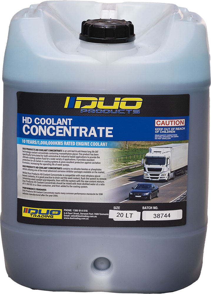 DUO PRODUCTS HD COOLANT CONCENTRATE is a unique blend of organic long life corrosion inhibitors and ethylene glycol designed to provide superior corrosion protection and anti-freeze / anti-boil protection for all types of petrol, diesel, and gas engines in heavy duty commercial, industrial, on-highway, marine, mining, and stationary equipment, as well as light commercial and passenger vehicles.