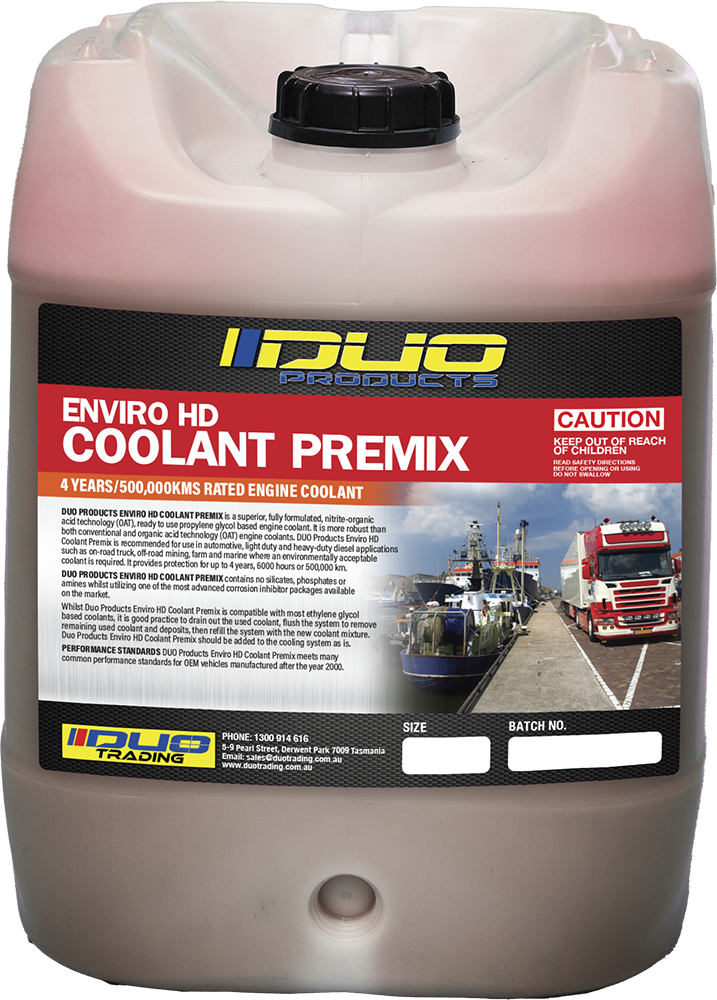 DUO PRODUCTS ENVIRO HD COOLANT PREMIX contains no silicates, phosphates or amines whilst utilising one of the most advanced corrosion inhibitor packages available on the market.
